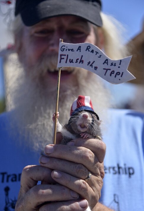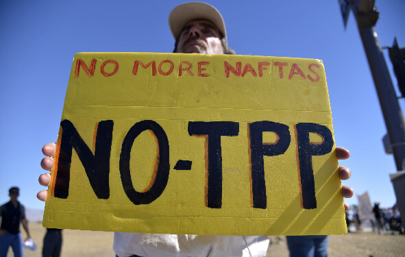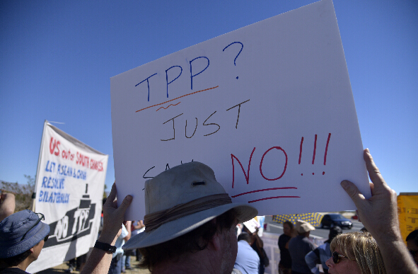 2月15日,在美国加利福尼亚州的兰乔米拉日,一名男子举着反对“跨太平洋伙伴关系协定”(TPP)的标语牌抗议美国与东盟国家领导人非正式会议。