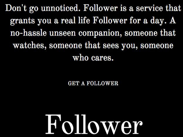 據CityLab報道,紐約大學的一位老師Lauren McCarthy做了一款叫Follower的應用,讓你可以找人來跟蹤(follow)自己。但是跟蹤者和被跟蹤者并不會有面對面的交流,跟蹤者只會在暗處跟隨被跟蹤者,并不時的發一些“偷拍”照片(比如你等紅綠燈過馬路、吃飯、抽煙等)給被跟蹤者,讓他知道自己一直在被關注。當跟蹤結束之后,跟蹤者也會明確告知被跟蹤者,然后消失在人群中。