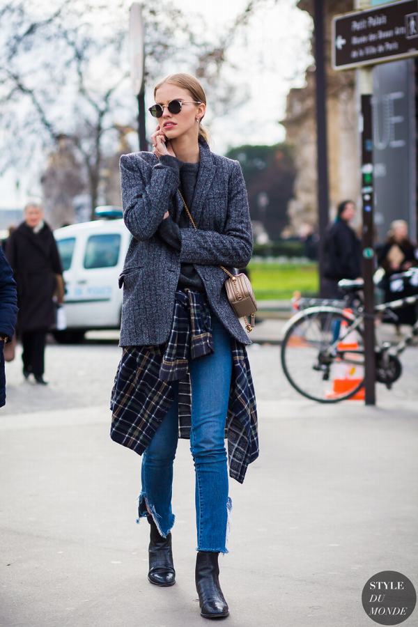 最简单的一招就是将衬衫系在腰间,立刻就变得非常有范儿,还能悄悄挡住了略宽的臀部哦。