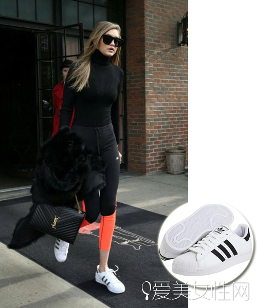 为保持身材,超模们可下了不少功夫哦!Gigi出门运动穿的这双Adidas Originals Superstar Sneakers款式非常大气,搭配运动装和大衣,舒服之余又跟得上潮流。