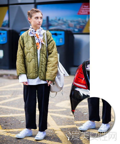 本来西装裤宽松的裤型而且质地轻薄,很多人都喜欢穿的,无奈过于正式,搭配一双白球鞋就可以解决你的烦恼了,街头随性风轻松打造。