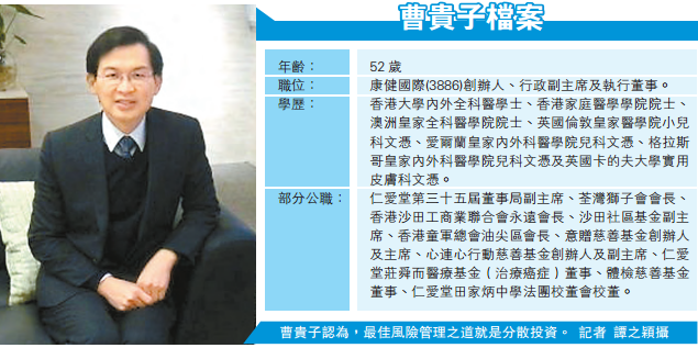 企業做風險管理為應對突發危機,康健國際(3886)創辦人兼行政副主席曹貴子縱橫商界和醫學界多載,得出一個結論:「人生的每一刻都是風險管理」。見證生離死別,見盡股市起落,他認為最佳風險管理之道就是「分散投資」。曹貴子把人生分為「半生慈善,半生事業」,他感悟生命的可貴,注重親友的相聚,同時不忘回饋社會。香港商報記者譚之穎