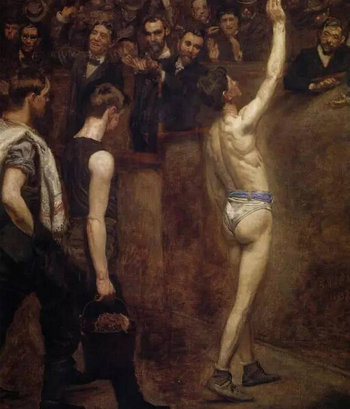 19世纪末,大学橄榄球、划艇,特别是拳击运动成为振兴阳刚之美的方式。而这些对于男性身体的赞颂也成为同性情欲审美的一次机会。在《致意》中,全体男性观众喊叫着表达他们的支持,不仅是对拳手的技术,更是对他的身体。将男性身体而非传统的女性裸体作为欲望的客体,伊金思强迫我们对欲望的双关进行思考。