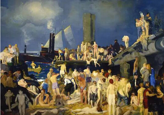 20世纪初期,大量年轻人从国外、从内陆地区涌入美国大都市,寻求工作、社会地位,与他们原本的生活一刀两断。在灼热阳光烘烤下,男孩和男人们从码头跳入水中嬉游、社交。乔治·贝娄在绘画中捕捉到一些城市生活场景,既表现出城市的活力,也是为底层人民生活起草的一份起诉书。