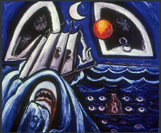 夏尔·德牧思的艺术作品分为两部分。作为和291画廊的签约画家,他画了大量高度现代主义的抽象作品。另一方面,作为一个男性同性恋,他也画了很多表现gay现实生活的作品,当然这些作品不是为了大规模流传而画的。在这幅作品中,德牧思表现了纽约港口一群水手要离开时的场景,这是艺术家最喜欢的主题之一。这些场景表现出海军舰队与世隔绝的环境下的男性关系,以及社会性别的“扭曲”。