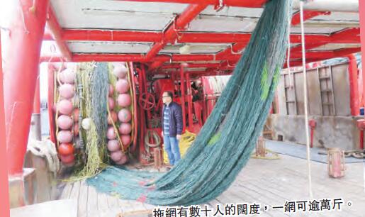 他的漁船是37米長的拖網,可深海作業,最遠去到近300海里的臺灣淺灘外,但須夥拍另一隻拖網運作,雙拖在大海中合力拉出一個大魚網,有30多人的闊度(有些拖網更大,逾百人闊度)。早上7時落網,下午4、5時左右起網。工人負責絞網、揀魚及入箱,他這個小老闆則掌控漁船,包括令拖網保持定位,機房運作暢順等。已分門別類的魚等待漁商來批收。一年中有200多天的日子都是這樣過,沒家人在身旁,沒朋友可談天,只與大海為伴。