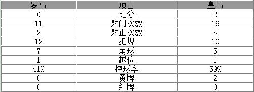 皇马全场控球率达到59%,射门19次,比主队多8射。客队射正5次打入2球,进攻效率远超罗马。各项统计皇马均略占优势,斩获两粒关键的客场进球,主队角球次数更多,但未能建功。