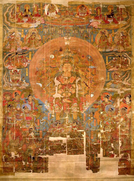 在敦煌藏经洞曾出土过一幅唐中期的千手观音帛画,其中有摩诃迦罗天(大黑天)在画面左侧。