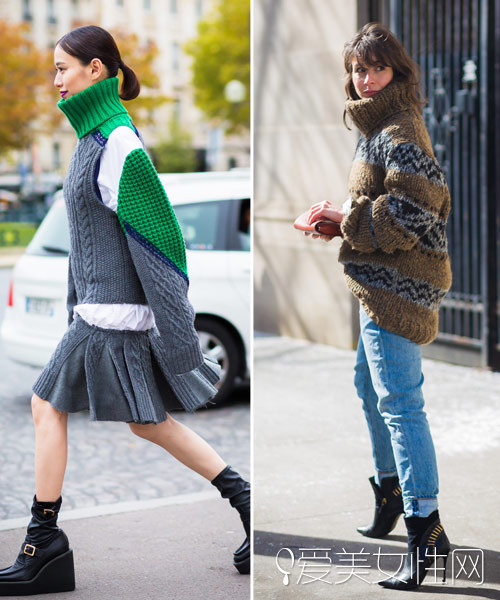Right:搭配裤装虽然很简单随意,却因为大高领造型感一点都没落后,如果你怕厚重的毛衣会把你显得很臃肿,可以像达人一样将前面的毛衣束进裤子里,打造前短后长的效果。