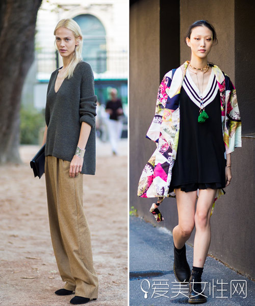 Left:大V领的灰色毛衣搭配阔腿裤,不仅脸部,身材变得非常高挑纤瘦,为防止感冒,在外面加件棕色大衣就非常完美啦,不过一定要把V领给露出来哦,不然心思就白费啦!