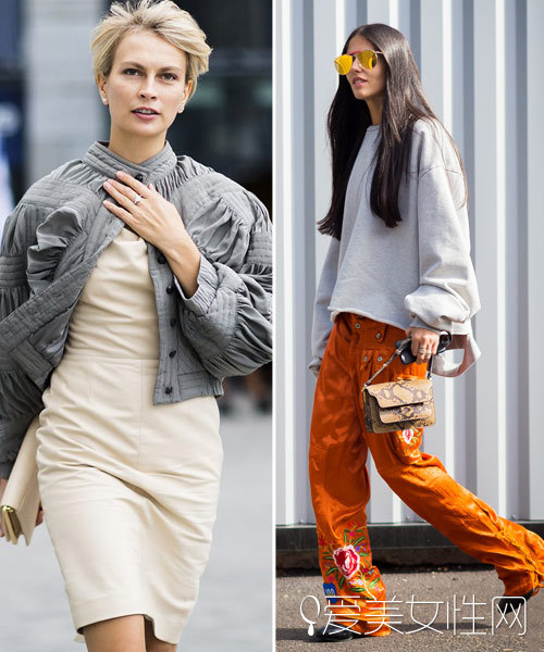 Left:宽大的袖型能够帮你全方位地遮住胳膊,让人摸不清你胳膊的size,短款的设计和修身剪裁的连衣裙又能让人产生你全身都恨瘦的“错觉”!除了这种外套,差不多版型的飞行夹克和棒球服也可以是你的选项哦!