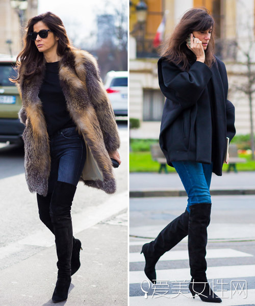 穿过膝靴也是很好的修饰腿型的好方法!购买长至大腿的过膝靴已经很大一部分包住了双腿了,剩下的利用裤子与过膝靴的对比色产生化学作用,大腿与过膝靴连成一体,看起来双腿变得又长又细,小粗腿马上就不见了。既然过膝靴是重头戏,其他单品搭配就尽量从简咯,其他的,看图领会吧!