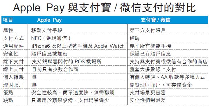 有人说Apple Pay姗姗来迟,拿什麽跟支付宝和微信竞争呢?据中国互联网络信息中心,2015年中,大陆使用线上支付的人次多达3.59亿,6个月成长近18%。其中,支付宝和微信占主要份额。满城的便利店、咖啡店、小饭馆都支持支付宝和微信了。虽然支付宝和微信已经有了很成熟的市场体系,但Ap-ple Pay也有自己的鲜明特点。首先,Apple Pay主打的是安全和隐私。苹果是在中国没有支付牌照,所以Apple Pay只是为银行和用户之间支付沟通提供一种技术解决方案,所有用户的银行信息和付款信息全部掌握在银行,不掌握在苹果公司。在保护隐私性方面,由於苹果不掌握用户银行信息和消费信息,也就是说,苹果拉不出一张年底或月度的消费记录给用户,也不会根据用户的消费习惯给用户提供自认为合适的广告。另外,由於使用了近场无线通讯技术,Ap-ple Pay的支付过程,不需要移动网络支持。从使用流程看,Apple Pay只要靠近POS机,按指纹两步就可完成,比其他支付方式打开应用、扫码等步骤更加简洁。尤其在移动信号不好或者网络不顺畅的环境下,Apple Pay的支付便捷性更加有优势。不过,Apple Pay将采用何种方式吸引商户和消费者,顺利在内地推广,也将是一大难题。想改变用户的移动支付习惯,仍有漫长的路要走。