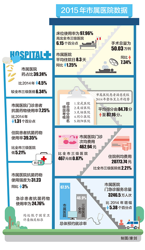 去年,本市致力于將優質醫療資源覆蓋北京遠郊及周邊地區,各醫院的就診壓力有所緩解。數據顯示,2015年市屬醫院門急診服務總量為3246.5萬人次,比2014年增幅下降5.38個百分點;出院人數為76.45萬人次,比2014年增幅下降5.9個百分點。