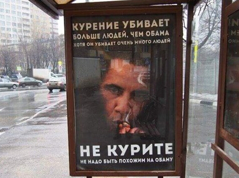 据英国《每日邮报》2月18日报道,近日,在莫斯科街头出现一则广告,警告俄罗斯烟民称:吸烟导致的死亡比奥巴马杀死的人还要多。
