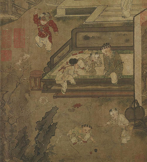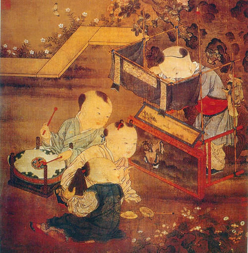 《梦粱录》列出的“影戏线索、傀儡儿、狮子、猫儿”,都是给儿童玩耍的玩具傀儡。图为台北故宫博物院收藏有一幅传为宋人的《傀儡婴戏图》,描绘了四名童子在表演提丝傀儡戏。 图为台北故宫博物院珍藏的一幅传为苏汉臣的《婴戏图》,图像下端,那两名孩子玩的就是“打娇惜”。他们上方的地上,还有一辆制作颇为精致的玩具车。 图为李嵩《市担婴戏图》,据研究玩具史的清华大学王连海教授的观察,图中货郎贩卖的小商品,除了日用杂货与时蔬酒果之外,最多的就是儿童玩具了,可辨识者有如下诸种:小鸟、鸟笼、拨浪鼓、小竹篓、香包、不倒翁、泥人、小炉灶、小壶等等。 图为苏汉臣的《秋庭戏婴图》(台北故宫博物院藏),图中一对小姐弟正趴在圆墩上玩小游戏,这游戏叫“推枣磨”,玩具是自制的。此外,小姐弟身边还有一个圆墩,上面也堆放着几个小玩具:人马转轮、八宝纹纸格、玳瑁盘、小陀螺、红色佛塔、棋盒。地上还散落了一对小铙钹。 图为美国大都会艺术博物馆收藏的一幅《婴戏图》,当为元人作品。图中上方有个巨大的木制滑梯。此外,还有两名小孩在骑竹马。竹马是古时很常见的玩具,宋代的竹马制作得很是精致,不但有了或木刻或纸糊的“马头”,竹马的后端还装上了两只轮子。