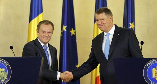 欧洲理事会主席图斯克(左)和罗马尼亚总统约翰尼斯出席联合新闻发布会
