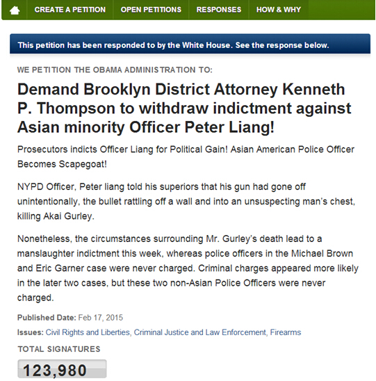 据美媒2月20日报道,纽约华裔警察梁彼得被定罪后引起全美华人的不满与愤怒,为了声援梁彼得,在美华人在白宫请愿网站上发表请愿书,要求检察官撤销对梁彼得的起诉。至请愿结束,请愿书上已经有近12.4万民众签字。美国白宫做出了回应。