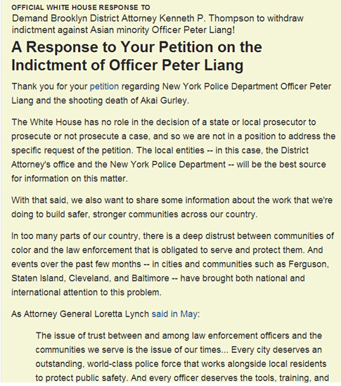 白宫请愿网站回复到:“白宫不能插手决定州检察官或者地区检察官是否对某人提出起诉,对于此案,纽约市警察局和地区检察官才是此案更多信息的最佳来源。”白宫还表示,当局一直致力创建更安全,更强大的社区。然而在全美多地,不同肤色的种族和执法机关之间却存在着深深的不信任。执法机关是为了保护人们的安全,而在过去的一段时间中,无论是弗格森还是纽约的史丹顿岛,亦或是克利夫兰还是巴尔的摩(这些城市都发生过具有争议的非裔在警员执法过程中致死事件),这些事件都让全美甚至世界都关注这一问题。正像五月份司法部长林奇所说的,警民之间的信任问题是这个时代的问题,每个城市都应该有属于自己的世界一流的警力为民众的安全服务。而每一个警员,都应该享有相应的训练,工具和支持来保证他们有效安全的做好本职工作。