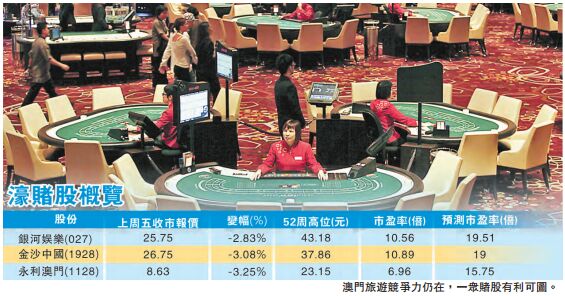 自上周五各賭場的營業數據未如人意,濠賭股表現全線向下。不過,早前澳門中聯辦主任李剛表示,中央研究支持澳門政府發展經濟,令人憧憬澳門博彩業發展前景,賭股板塊股價最近回落或正好提供撈底的機會。