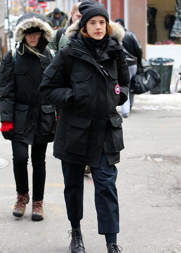 卡莉-克劳斯Canada Goose硬朗军旅风外套+紧身裤+Balenciaga挎包,混搭出新潮的运动装LOOK。