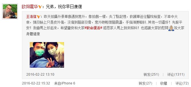 凤凰娱乐讯 2月22日下午,TVB演员王浩信微博中自曝拍戏时意外受伤。他在微博写道:“昨天拍摄外景车戏遇到意外,像拍戏一样,失了点记忆,救护车送往医院检查,不幸中大幸,头及脸上只是皮外伤,没伤到脑部及骨,意外时轻微脑震荡,手指须要联针,其他一切还好!先报平安!我会马上好起来,感恩家人马上到来照料!也感谢大家的慰问,祝大家身体健康。”照片中的王浩信头上包着绷带,闭眼躺在病床上,看起来十分虚弱。随后欧阳震华转发该微博并送上祝福:“兄弟,祝你早日康复!”