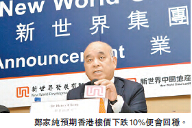 鄭家純預期,今年香港樓價不會大跌,樓價下跌10%便會回穩,由於地價不便宜,建築成本持續增加,新世界只會價錢合理賣樓。至於增加土地儲備方面,鄭家純稱,集團繼續持審慎樂觀的態度,會以不同形式增加土儲,價錢合適便會入貨。
