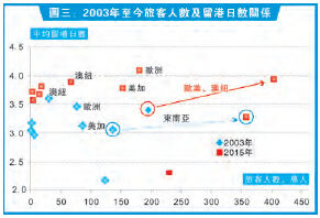 來自歐美等發達國家的旅客好像已被港人遺忘,這或許跟他們的消費習慣有關。數據顯示歐美旅客傾向消費於酒店住宿上,占超過他們的總開支五成,但內地客及東南亞客卻把這五成開支用於零售消費上。很明顯,由於受惠於零售業暢旺的打工仔應較酒店業為多,港人會較易感受到內地客來港的影響力。但要長期維持香港旅游業的健康發展,這批發達國家的旅客仍然不可忽視。圖三見到,除了來自歐美、澳紐的旅客人數仍高於東南亞旅客外,十多年間歐美等旅客的留港日數亦由3.41上升至3.93,升幅高於東南亞旅客。消費力強,過夜日數亦多,這不是眾樂園管理層所要的嗎?