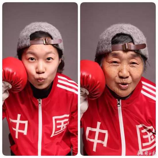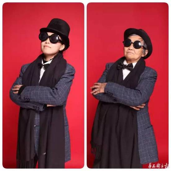 “以前奶奶拍的照片,大多是‘到此一游’类型的,没有什么新意。”席雨说,恰巧丈夫是位摄影发烧友,有了另一半的全程鼎力相助,这场特别的拍摄变得更加轻松自然。 爱拍照、喜欢笑,老人的乐观开朗,无形中增加了孙女和孙女婿的动力。听说要带她去拍照,老人立即变得特别兴奋起来,席雨说,这正是她带奶奶拍照的初衷,也希望能带一些新鲜事物给她感受。没想到,照片真是非常完美。席雨特地将奶奶的照片装进相框,摆放在家里显眼位置,让她随时都能乐一乐。 无需化妆 情流露重返青春 头戴蓬松假发,手握黄色手掌道具,老人俏皮的动作中,流露出了拍摄时候的轻松和惬意,真实的神情在不同的照片都有展现。这组图一经上传网络,迅速激起网友共鸣。席雨表示,拍摄之初,奶奶还觉得怎么把自己弄得像个孩子,有些不好意思,但是通过孙女、孙女婿做示范,很快也跟着大家开心玩起来,顷刻间返老还童。 在拍摄一个需要做出“加油”姿势的动作时,老人开始还不清楚该用怎样的肢体语言表达,席雨一下子想到,穿上印有“中国”字样的运动服后,稍加提示应该就能表达到位。丈夫也在一旁说,“奶奶,你就想着中国打仗胜利了,给中国加油。”话音未落,只听“咔擦”一声,按下快门的瞬间,就已捕捉到了老人到位的表情。 一番拍摄下来,整组照片,共换了4套服装,只花了半个小时。席雨表示,他们没有因追求视觉效果,刻意给奶奶化妆,反而是想让她自然的真情流露。因此拍摄过程中,所有的动作都是一次到位。 很多网友看到照片后,表示要回去给自己的爷爷奶奶拍一组。还有网友在羡慕的同时,也感言子欲养而亲不在,希望大家趁着节假日多陪伴老人。