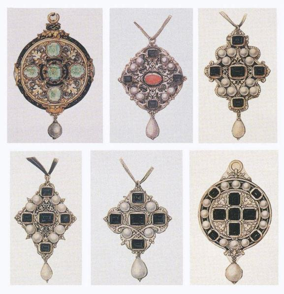 项链和胸口两个挂坠的设计显然由皇家画师荷尔拜因包办,有详尽的设计稿件为证。他设计的吊坠,是在胸针上加珍珠。看来旧物翻新或者一物多用是皇室也喜欢的勾当。