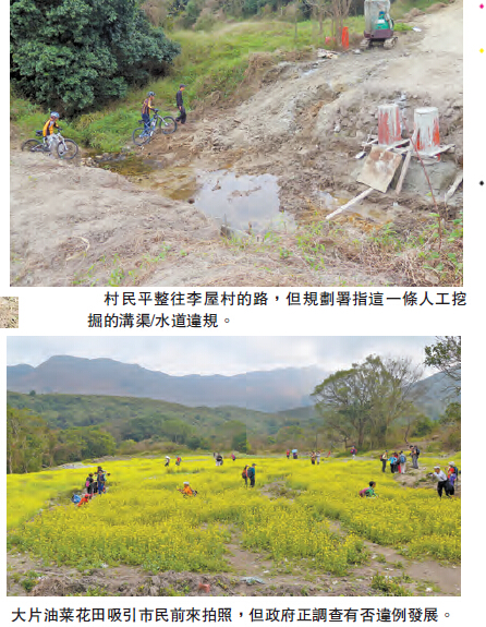 種植油菜花田的張屋村民稱發展商沒有履行合約,村民有權復耕並復村。李屋村的命運與張屋村相同,也希望將淹沒在雜草樹叢中,經過自然洗禮的一排排客家村屋修葺好,恢復原貌。去年11月張屋落油菜花種,也在差不多時間,由張屋通往李屋的路開始平整。在平整前,記者跟隨村民走了一趟,從張屋村起步,走向李氏祠堂,但道路難行,沿途遍布長草、碎石,一些低地更有小水氹。年初六那天,再走這條經過平整的路,發覺除了要走過一條淺水小河,走到李氏祠堂容易多了。