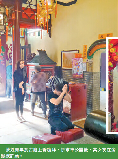 西貢蠔涌村「車公古廟」坐落蠔涌路旁。農曆年初六午後,記者來到「車公古廟」,空地上「金榜題名」板上貼滿祈福許願善信的許願,除了闔家歡樂、身體健康、生意興隆的願望之外,也有更加具體、明確的祈望,如:上海樓順利交收、年年月月爆數、我要女朋友,我要做醫生、我要做太空人,大古(吉)大利等,令圍觀的眾善信忍俊不禁。環顧古廟建築為二堂式廟,西側有附屬建築物包括太歲殿,從建築年份看,被政府列為一級歷史建築物的蠔涌「車公古廟」,相傳有數百年歷史。