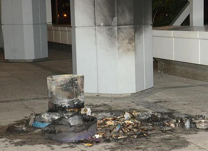 金钟高等法院图书馆对开,接近通往力宝中心的行人天桥口,一个垃圾桶於今晨零时许被发现离奇着火,消防员到场後迅速将火扑熄,但垃圾桶遭严重焚毁,附近石柱亦被熏黑。消防员经检查後无发现有易燃物品,但认为起火原因有可疑。