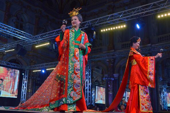 当地时间2月24日晚,2016年世界旅游小姐(MTI)环球金色使者海外表演赛在巴黎的洲际酒店举行。这批年龄在40至70岁之间的MTI金色使者中国总决赛冠军及精英选手上演巴黎首秀,向西方观众展示东方成熟女性和中国传统服饰之美。
