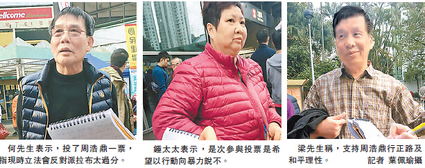 大埔居民周先生直指,對旺角暴亂十分反感,直斥「本土民主前線」慫恿年輕人參與暴亂,令年輕人無視法紀,破壞香港的繁榮穩定。他批評有候選人為暴徒提供法律協助,違背中立身份,更令年輕人以為自己做的事是正確,日后可以更為所欲為。他說,會投票支持和平、理性及了解社區的候選人。