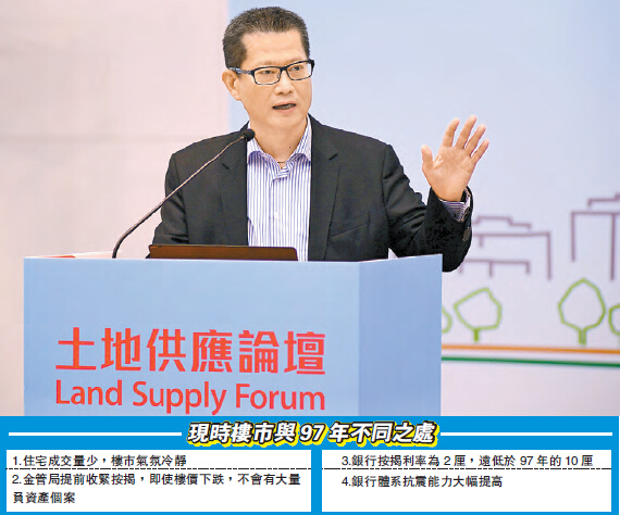 在按揭方面,金管局自2009年開始,已先后七次收緊住宅及其他類別物業的按揭成數上限,嚴控金融系統風險。其中在去年2月,700萬元以下物業的按揭上限更收緊至60%。陳茂波稱,措施當時壓抑了部分需求,但亦減少了去年巿場上一些需要借八成或九成按揭「上車」的個案;在這情況下,即使樓價下跌一、兩成,也不至於立即出現大量負資產個案。