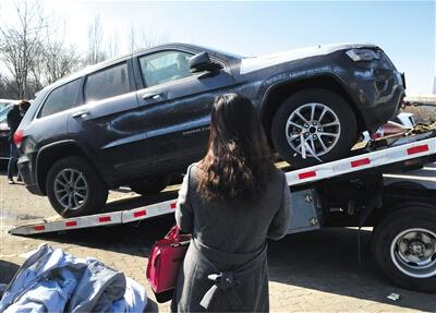 2月25日,天津中電物流停車場,一女子花30余萬元購買的一輛大切諾基,準備用拖車拖走。經記者查詢,此停車場有23輛Jeep車為天津港爆炸受損車輛。