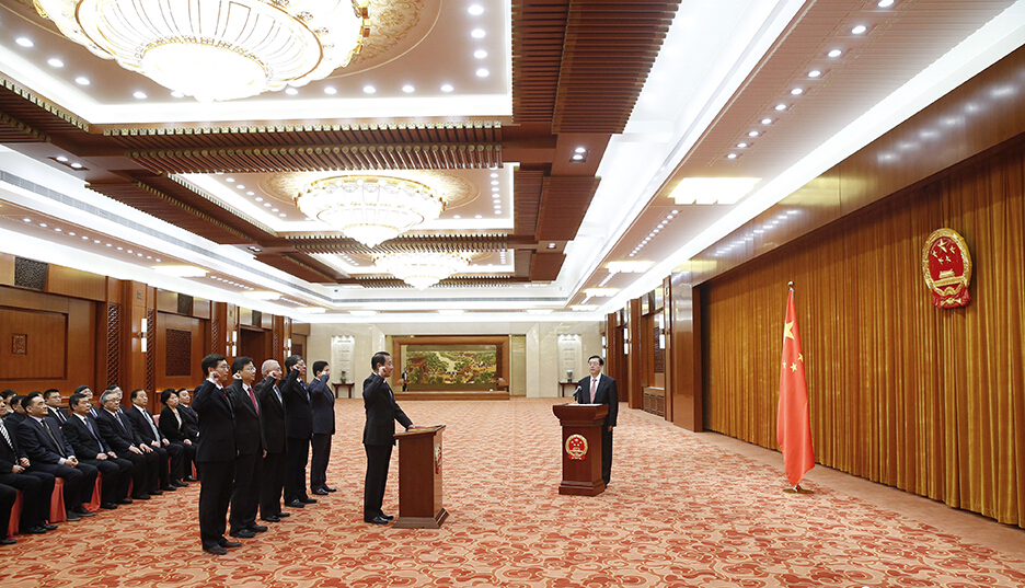 2月26日,十二屆全國人大常委會在北京人民大會堂首次舉行憲法宣誓儀式,張德江委員長主持并監誓。剛剛閉幕的十二屆全國人大常委會第十九次會議任命了全國人大有關專門委員會副主任委員、常委會工作委員會副主任等六名國家工作人員,依法進行憲法宣誓。