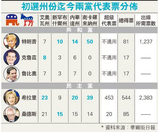 今日舉行初選或黨團會議的共有13個州及1個海外屬地,其中共和黨參選人將競逐出線所需的1237張選舉人票中近半票數,民主黨參選人則爭奪880張選舉人票,占出線所需票數約三分之一。《華爾街日報》聯同全國廣播公司(NBC)及馬里斯特學院(Marist)進行的民調顯示,希拉里在重點州份得州、喬治亞州及田納西州大幅領先對手桑德斯,差距高達34個百分點。特朗普在喬治亞及田納西等州份亦遙遙領先,不過在得州則被該州聯邦參議員克魯茲壓制,差距達雙位數。
