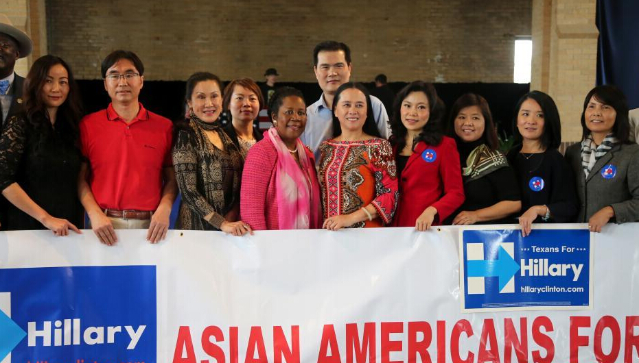 希拉里亞裔助選委員會成員與支持希拉里的國會議員希拉·杰克遜·李(前排右六)合影。 中新社記者 王歡 攝