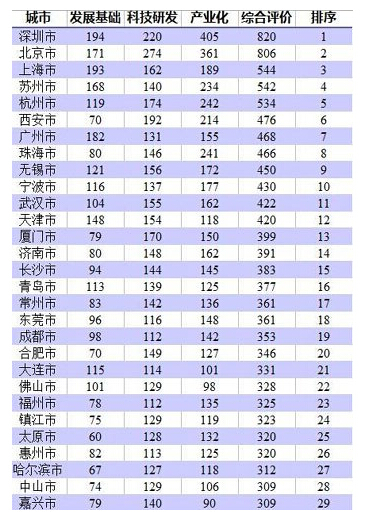 2月29日,廣東省社會科學院與南方報業傳媒集團共同發佈的《中國城市創新指數》(以下簡稱“報告”)顯示,在全國60個城市中,深圳創新指數得分最高,北京緊隨其後,上海居第三位。前10名中餘下城市依次為蘇州、杭州、西安、廣州、珠海、無錫和寧波。