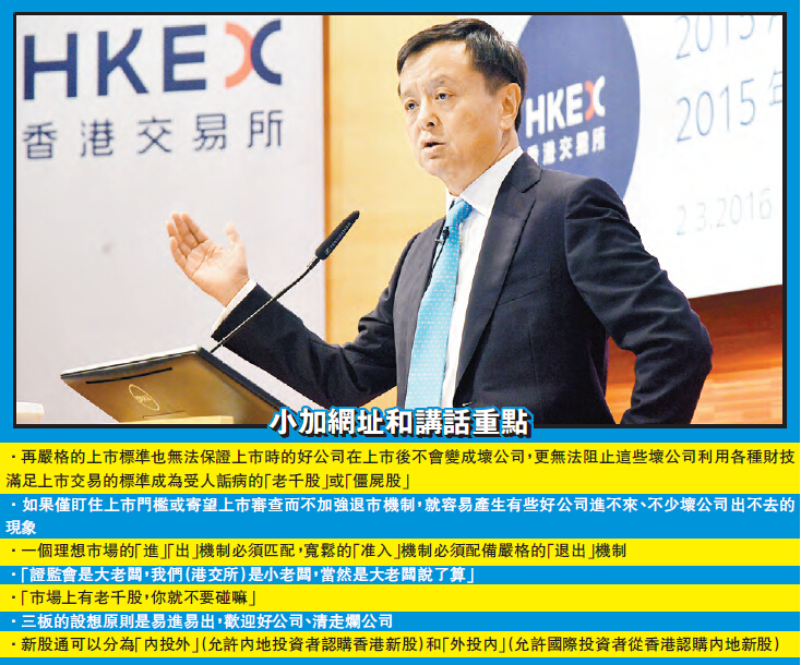 李小加昨在網誌表示,股票上市業務是香港交易所的核心傳統業務,提高準入門檻的方法確有助擋住部分壞公司,也肯定會把一部分潛在好公司關在門外。再嚴格的上市標準也無法保證上市時的好公司在上市后不會變成壞公司,更無法阻止這些壞公司利用各種財技滿足上市交易的標準成為受人詬病的「老千股」或「僵尸股」。