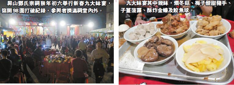 【香港商報网訊】記者余江強報道:元朗屏山鄧氏宗祠每年「新正頭」均會舉辦大型盆菜宴。著名時裝設計師鄧達智昔日為母親賀壽,例與家人會在大年初三舉行盆菜宴;如今母親已仙遊,習俗依舊。猴年初六舉行的新春九大缽宴更打破紀錄,筵開98圍,除擠滿祠堂內,連祠堂外的大空地亦擺了枱,異常熱鬧。