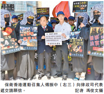 保衛香港運動召集人傅振中聯同70人,帶同「律政司快檢控『占中』搞手,強烈要求法官嚴懲暴徒」、「司法無準則,市民實死得」、「警察拉人,法官放人」等標語牌及橫額,到高等法院向律政司代表遞交請願信,要求法院維護法紀,嚴懲示威者及暴徒,并促請律政司果斷行動,盡快落案檢控「占中」核心人物,以及對參加旺角暴亂被補人士獲準保釋一事提出上訴,避免讓社會認為司法界姑息養奸。