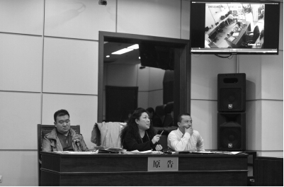 趙某(左)和代理人出庭。監控中顯示,去年5月1日章某在公司內。京華時報記者 趙思衡 攝