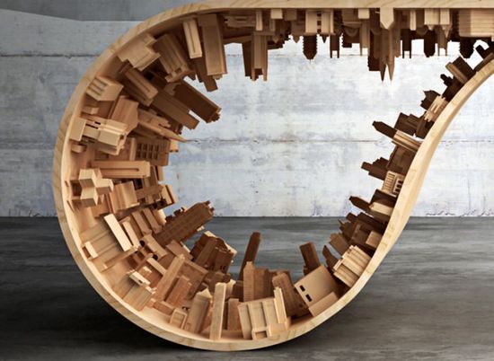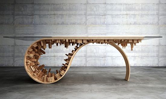 一月份我们介绍过塞浦路斯设计师Stelios Mousarris打造的“波浪城市/Wave City”咖啡桌。以木材、钢片为材质,用3D打印技术制作,设计师创建了一张卷曲叠立起来的咖啡桌,而卷曲的桌子内面则有经过精细雕琢、连续而又对立的城市风景。设计师在这个主题上继续发力,带来了这款升级版版的餐桌。其长宽高尺寸均有所增加,呈现起伏的S形,并在顶部放置了一张玻璃面板充当桌面。