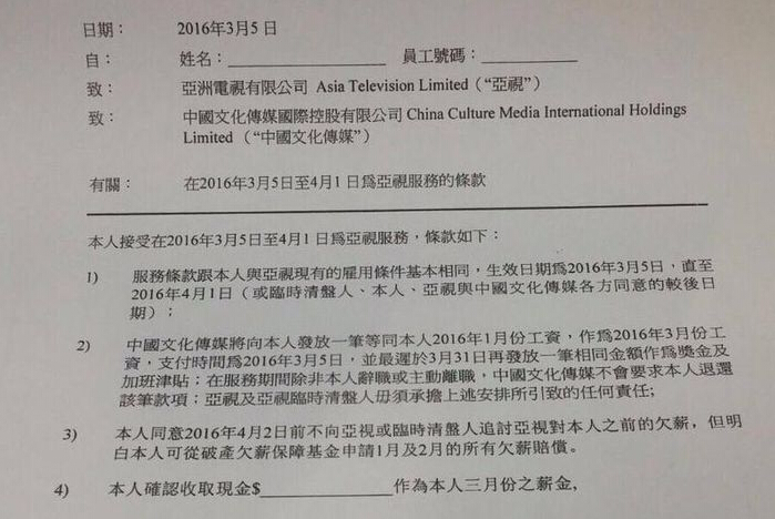 有簽了新約的員工指,簽約時要簽署一份函件,列明會工作至4月1日,除發放3月工資,公司最遲會在本月31日前,再發放一筆同等金額的錢作獎金及加班津貼。除非主動離職或離職,中國文化傳媒不會要求員工退還款項。另外,函件亦列明員工需同意在4月2日前,不會向亞視或臨時清盤人追討之前的欠薪,但明白員工可從破欠基金申請一月及二月的欠薪賠償。