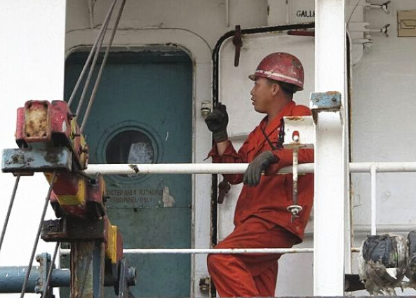 一名船員站在貨船甲板上。(圖片來源:新華/法新)