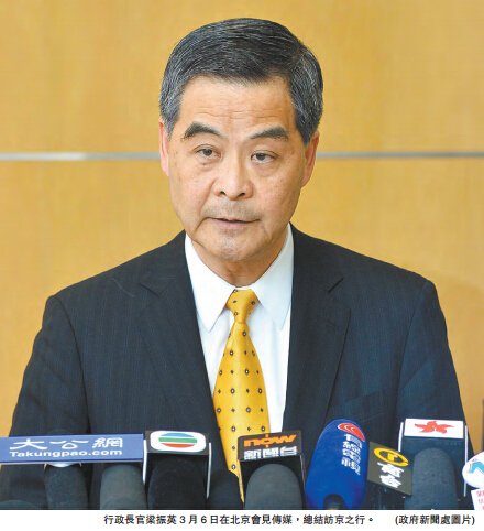 梁振英在总结时表示,这次访京4日,除了出席人大开幕式外,亦拜会了5个中央部委,包括国家科技部、港澳办、国家互联网信息办公室、人民银行和统战部,另又与广东省、深圳市、重庆市、北京市、广西自治区和澳门特别行政区的领导人深入交流,最后是与人大委员长张德江会面。