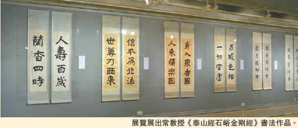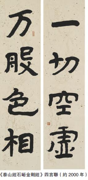 值得一提的是,陳教授雖居港多年,但始終不忘鄉土,在其往往喜歡在各類書作中屬款「之眾常宗豪」,流露出其背井離鄉的復雜心情。亦有在書作《集武梁祠聯》中題寫「壬子以來,流潦偏地,龜鳴聒耳,言念家山,因效復翁此聯寄慨……」而他的大字,則更多書寫《泰山經石峪金剛經》,陳博士指出,「這應該也與其心中那份桑梓之情不無關系,但無論是臨寫亦或是自運,均頗得箇中三味。」